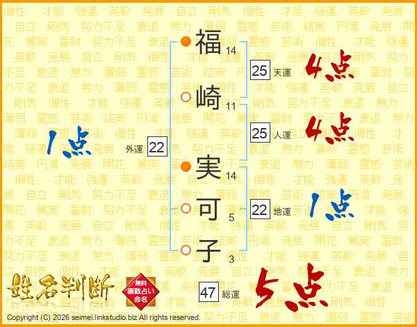 福(14画)崎(11画) 実(14画)可(5画)子(3画)