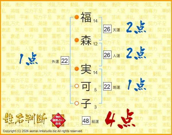 福(14画)森(12画) 実(14画)可(5画)子(3画)