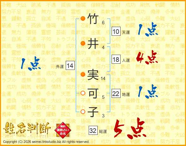竹(6画)井(4画) 実(14画)可(5画)子(3画)