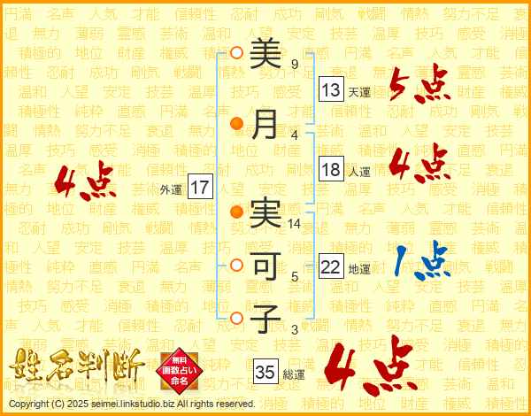 美(9画)月(4画) 実(14画)可(5画)子(3画)