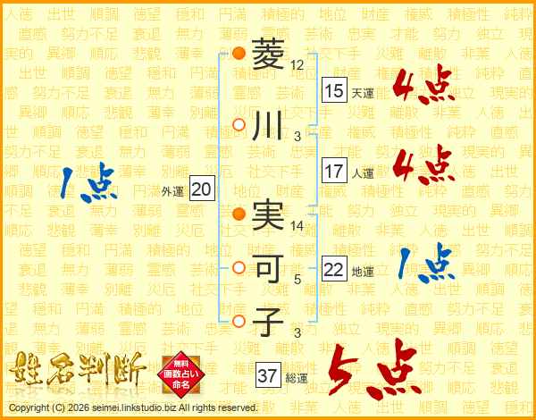 菱(12画)川(3画) 実(14画)可(5画)子(3画)