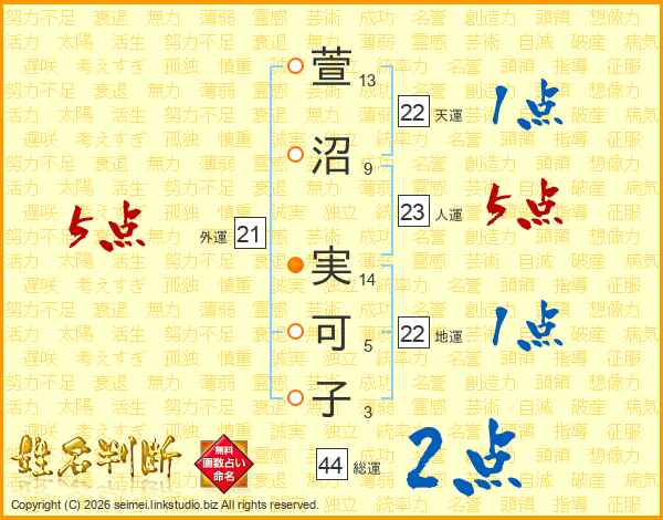 萱(13画)沼(9画) 実(14画)可(5画)子(3画)