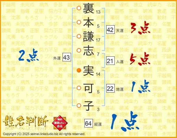 裏(13画)本(5画)謙(17画)志(7画) 実(14画)可(5画)子(3画)