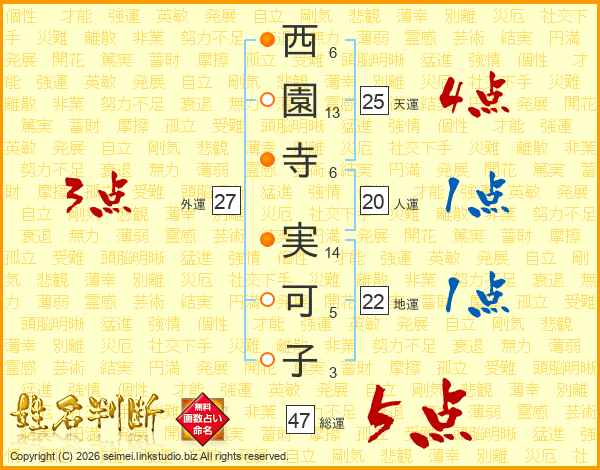 西(6画)園(13画)寺(6画) 実(14画)可(5画)子(3画)