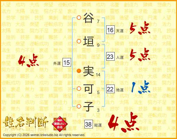 谷(7画)垣(9画) 実(14画)可(5画)子(3画)