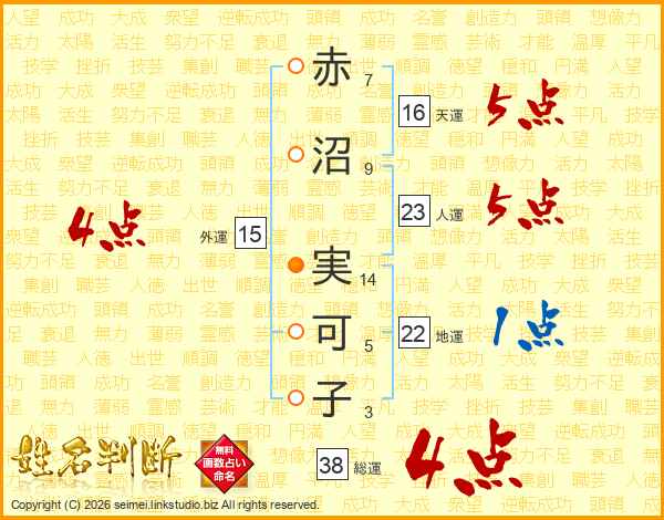 赤(7画)沼(9画) 実(14画)可(5画)子(3画)
