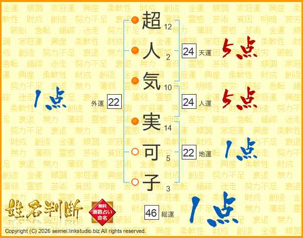 超(12画)人(2画)気(10画) 実(14画)可(5画)子(3画)
