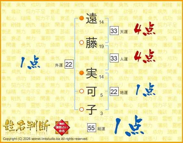 遠(14画)藤(19画) 実(14画)可(5画)子(3画)