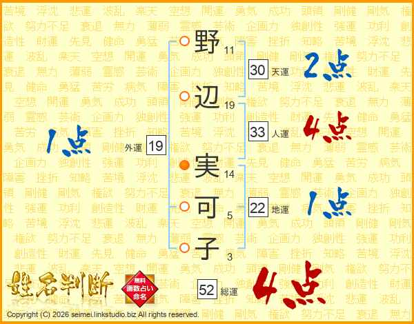 野辺実可子さんの総運は52画の4点!