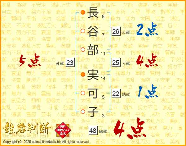長(8画)谷(7画)部(11画) 実(14画)可(5画)子(3画)