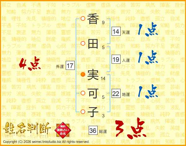 香(9画)田(5画) 実(14画)可(5画)子(3画)