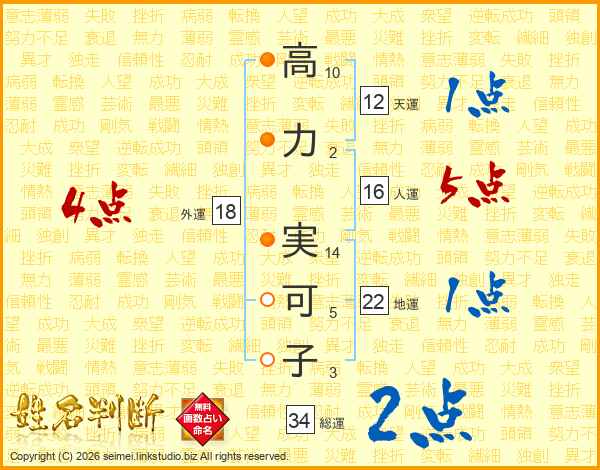 高(10画)力(2画) 実(14画)可(5画)子(3画)