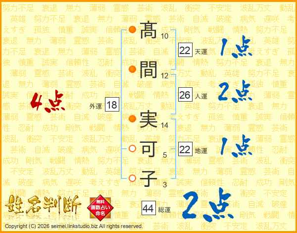 髙(10画)間(12画) 実(14画)可(5画)子(3画)
