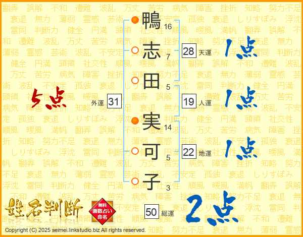 鴨(16画)志(7画)田(5画) 実(14画)可(5画)子(3画)