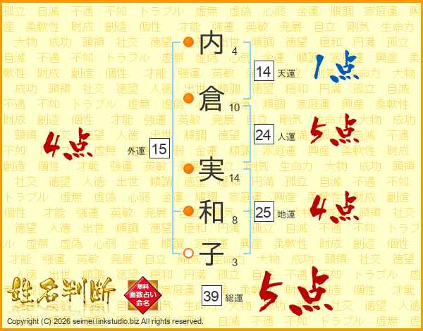 内(4画)倉(10画) 実(14画)和(8画)子(3画)