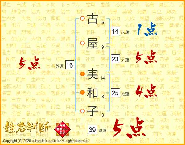 古(5画)屋(9画) 実(14画)和(8画)子(3画)