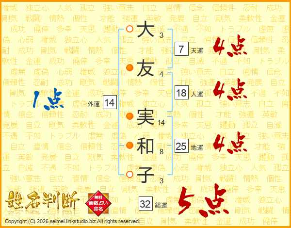 大(3画)友(4画) 実(14画)和(8画)子(3画)