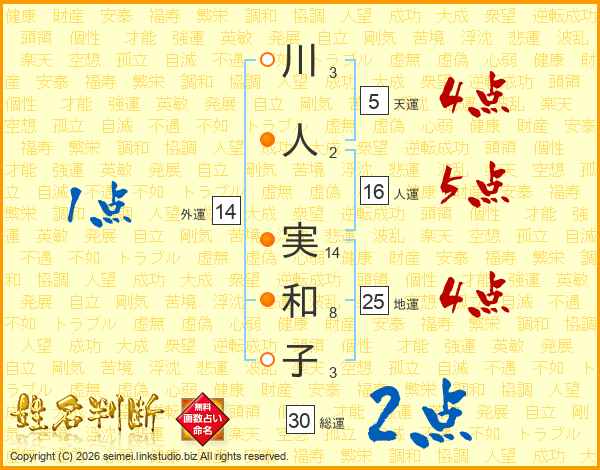 川(3画)人(2画) 実(14画)和(8画)子(3画)