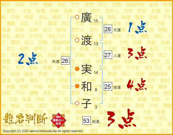 廣(15画)渡(13画) 実(14画)和(8画)子(3画)