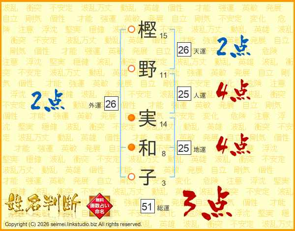 樫(15画)野(11画) 実(14画)和(8画)子(3画)