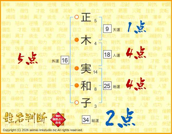 正(5画)木(4画) 実(14画)和(8画)子(3画)