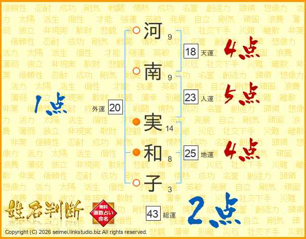 河(9画)南(9画) 実(14画)和(8画)子(3画)