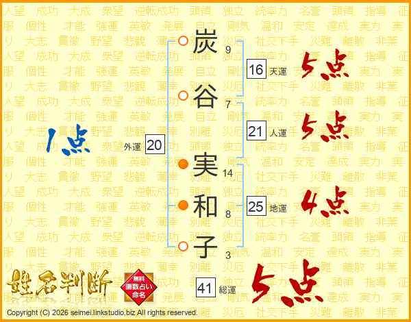 炭(9画)谷(7画) 実(14画)和(8画)子(3画)