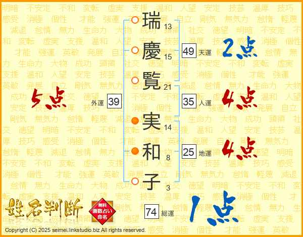 瑞(13画)慶(15画)覧(21画) 実(14画)和(8画)子(3画)