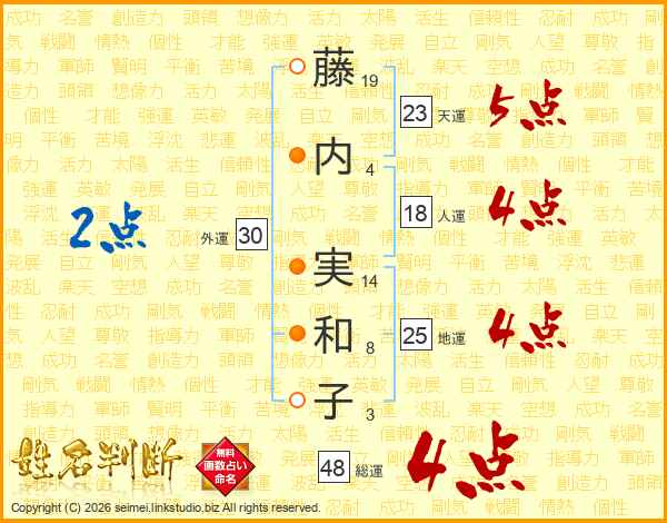 藤(19画)内(4画) 実(14画)和(8画)子(3画)