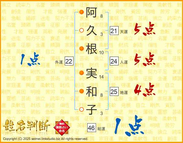 阿(8画)久(3画)根(10画) 実(14画)和(8画)子(3画)