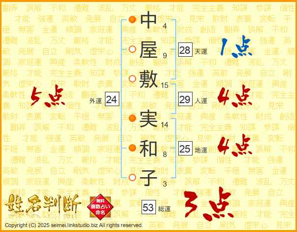 中(4画)屋(9画)敷(15画)  実(14画)和(8画)子(3画)
