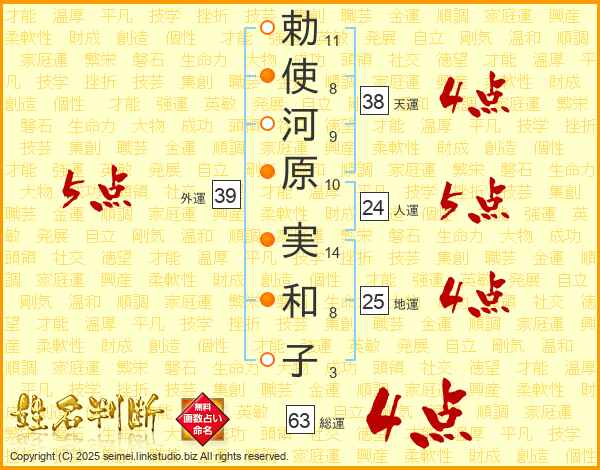 勅(11画)使(8画)河(9画)原(10画) 実(14画)和(8画)子(3画)