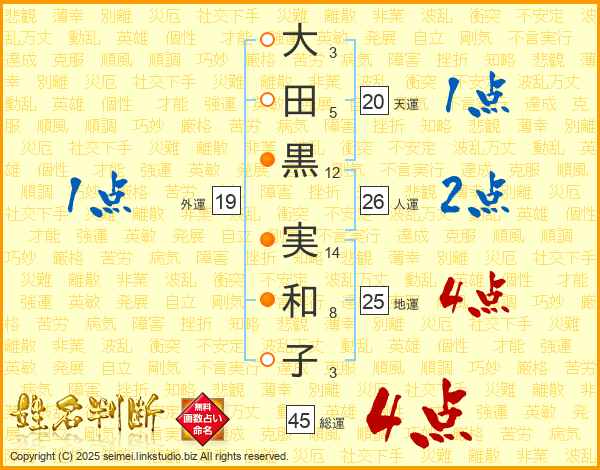 大(3画)田(5画)黒(12画) 実(14画)和(8画)子(3画)