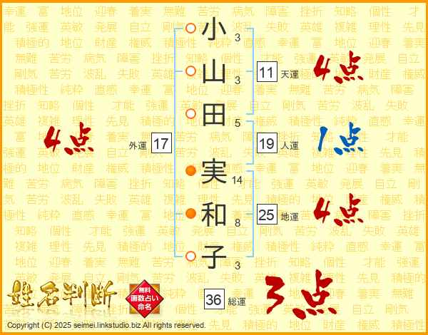 小(3画)山(3画)田(5画) 実(14画)和(8画)子(3画)