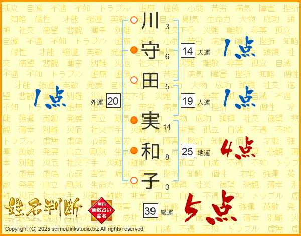 生活面を象徴する運勢です。外部から受ける影響力を表し、結婚運、家庭運や職場、環境への順応性を表します。総運から人運を引いた画数。姓や名が1文字の場合を除く。