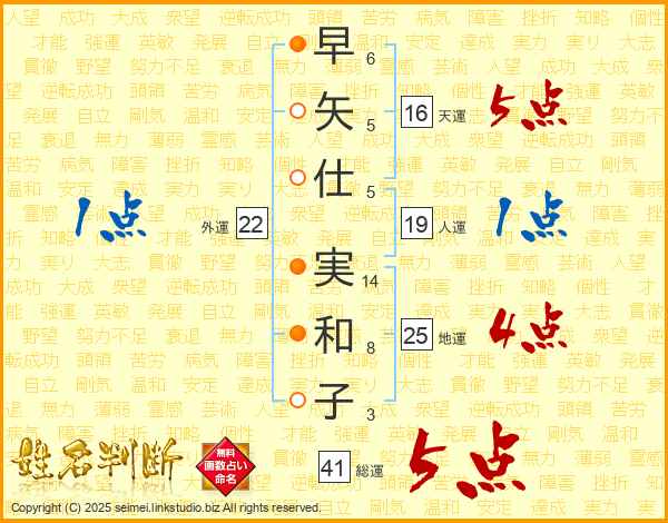 早(6画)矢(5画)仕(5画) 実(14画)和(8画)子(3画)