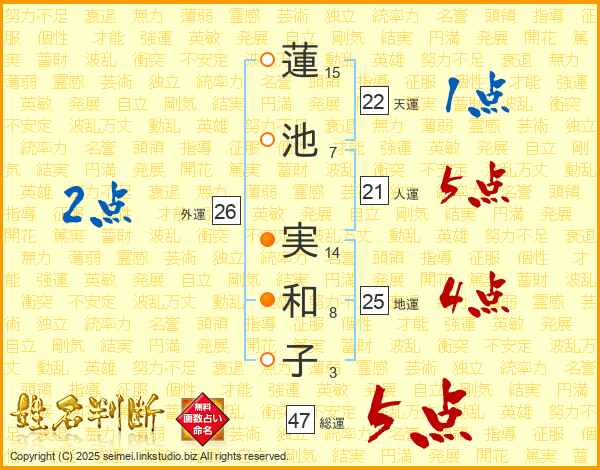 蓮(15画)池(7画) 実(14画)和(8画)子(3画)