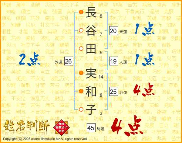 長(8画)谷(7画)田(5画)  実(14画)和(8画)子(3画)
