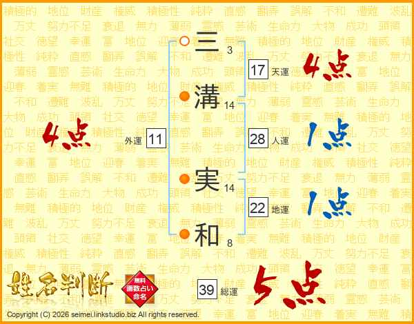 生活面を象徴する運勢です。外部から受ける影響力を表し、結婚運、家庭運や職場、環境への順応性を表します。総運から人運を引いた画数。姓や名が1文字の場合を除く。