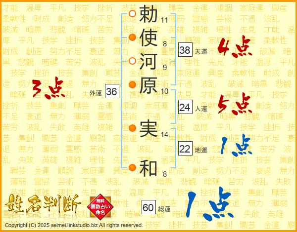 勅(11画)使(8画)河(9画)原(10画) 実(14画)和(8画)