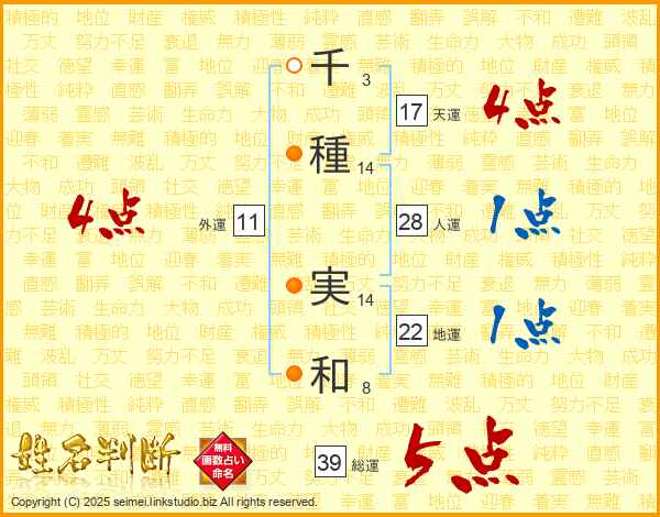 生活面を象徴する運勢です。外部から受ける影響力を表し、結婚運、家庭運や職場、環境への順応性を表します。総運から人運を引いた画数。姓や名が1文字の場合を除く。