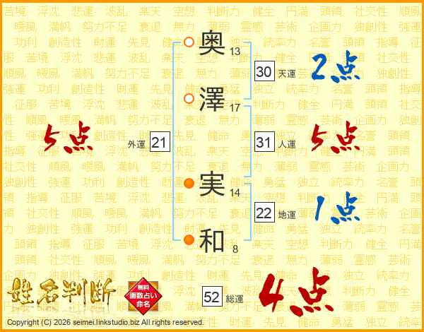 生活面を象徴する運勢です。外部から受ける影響力を表し、結婚運、家庭運や職場、環境への順応性を表します。総運から人運を引いた画数。姓や名が1文字の場合を除く。