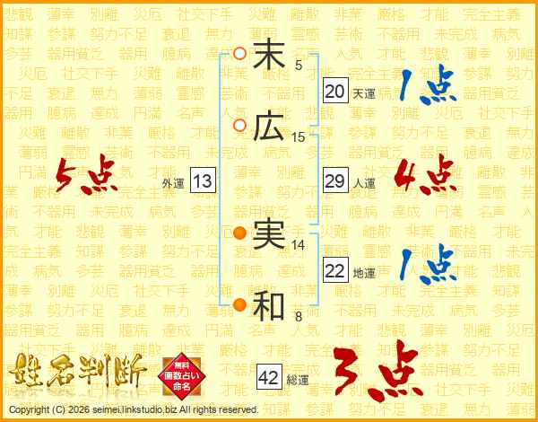 末(5画)広(15画) 実(14画)和(8画)
