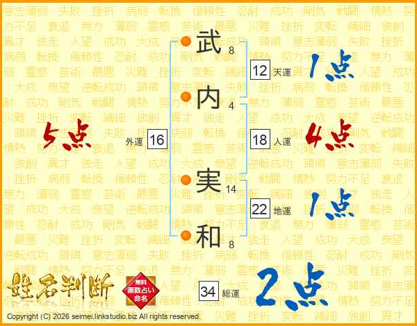 生活面を象徴する運勢です。外部から受ける影響力を表し、結婚運、家庭運や職場、環境への順応性を表します。総運から人運を引いた画数。姓や名が1文字の場合を除く。