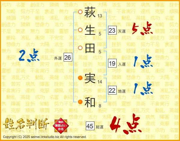 萩(13画)生(5画)田(5画) 実(14画)和(8画)