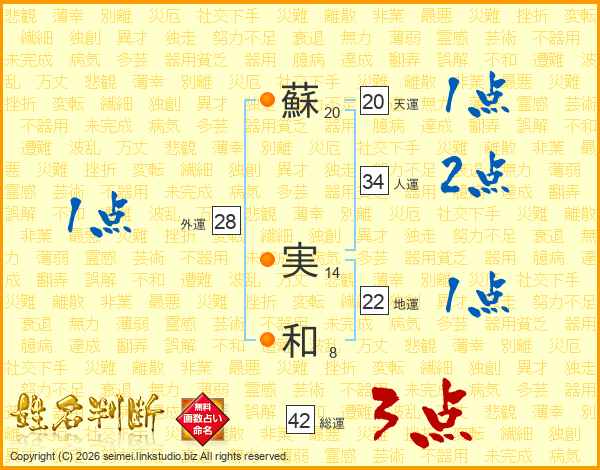 生活面を象徴する運勢です。外部から受ける影響力を表し、結婚運、家庭運や職場、環境への順応性を表します。総運から人運を引いた画数。姓や名が1文字の場合を除く。