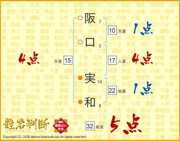 生活面を象徴する運勢です。外部から受ける影響力を表し、結婚運、家庭運や職場、環境への順応性を表します。総運から人運を引いた画数。姓や名が1文字の場合を除く。