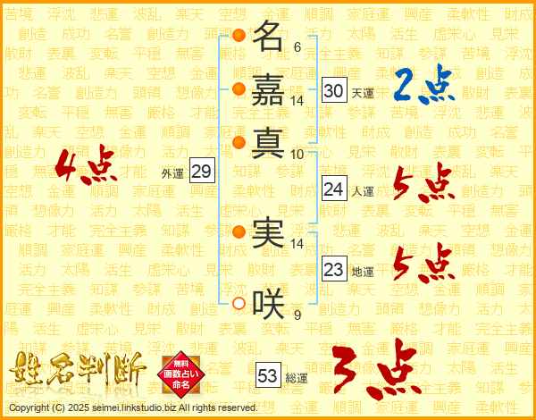 名(6画)嘉(14画)真(10画) 実(14画)咲(9画)