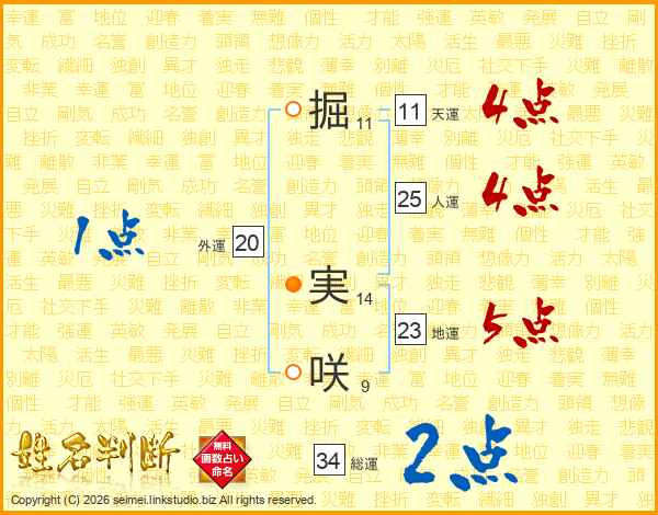掘(11画) 実(14画)咲(9画)