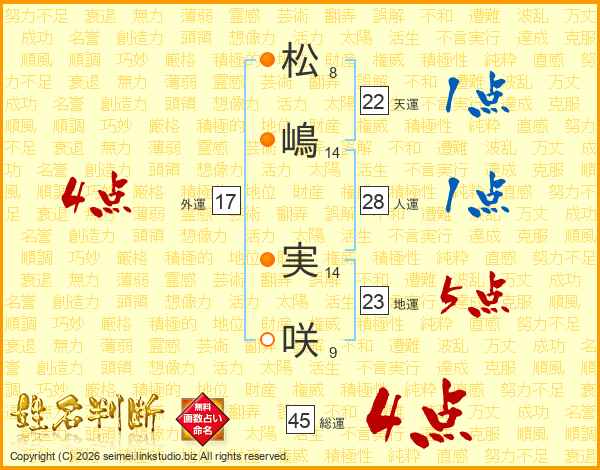 松(8画)嶋(14画) 実(14画)咲(9画)